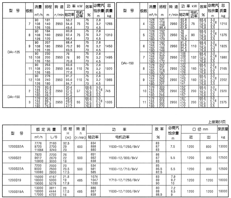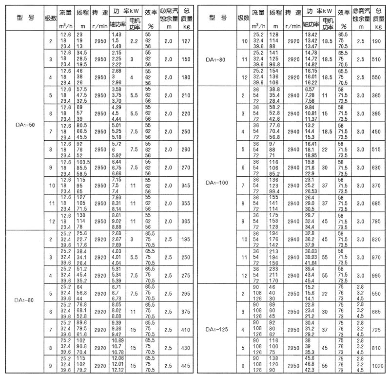 型號意義:如DA1-100X5。100-泵進、出口直徑(mm),5-泵的級數。