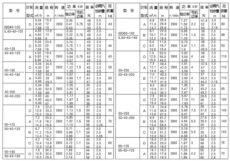 主要零件製造材料:泵(bèng)體、泵蓋(gài)一(yī)鑄鐵或球墨鑄鐵;葉輪一鑄鐵或鑄銅;軸一碳鋼或不鏽鋼。泵型號(hào)中(zhōng)數字的意義:如ISG100--200,100--進、出(chū)口直徑(mm),200--葉輪名義(yì)直徑。IL200-150-250B,200--進口(kǒu)直徑(mm),15 0--出口直(zhí)徑(mm),250B—-葉(yè)輪直徑經第二次(cì)切割。